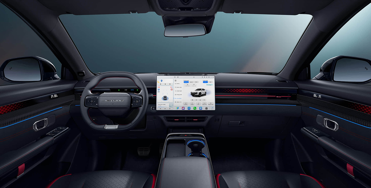 Палитра кузова включает 5 цветовых решений: «Галактический черный», «Лунный белый», «Шелковый красный», «Ванильный голубой» и «Призрачный серый». При этом Jetour предлагает клиентам два варианта цветового исполнения салона: красно-черный и серо-белый.